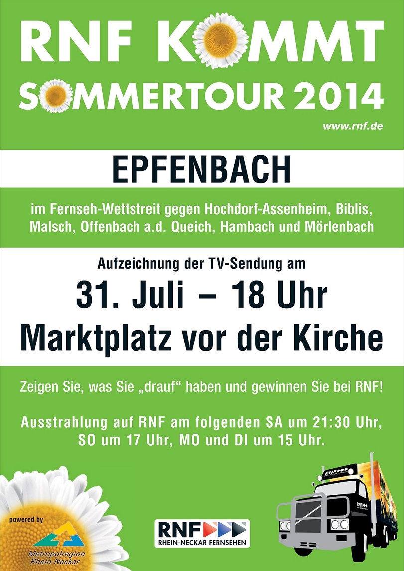 Natürlich kommen die bunten Bilder der RNF-Sommertour auch ins RNF-Programm – vier Mal wird die einstündige Aufzeichnung aus jeder Gemeinde ausgestrahlt, die Höhepunkte gibt es auch im TV-Regionalmagazin RNF Life. Zu sehen ist die RNF-Sommertour regional im Kabel, europaweit über Satellit und auch bundesweit via IPTV (T-Home Entertain). Im RNF-Videoportal rnf.de rollt die Sommertour außerdem mit vielen Zusatzinformationen. Über Facebook zeigen wir Ihnen ganz aktuell die neuesten und schönsten Bilder der Sommertour.