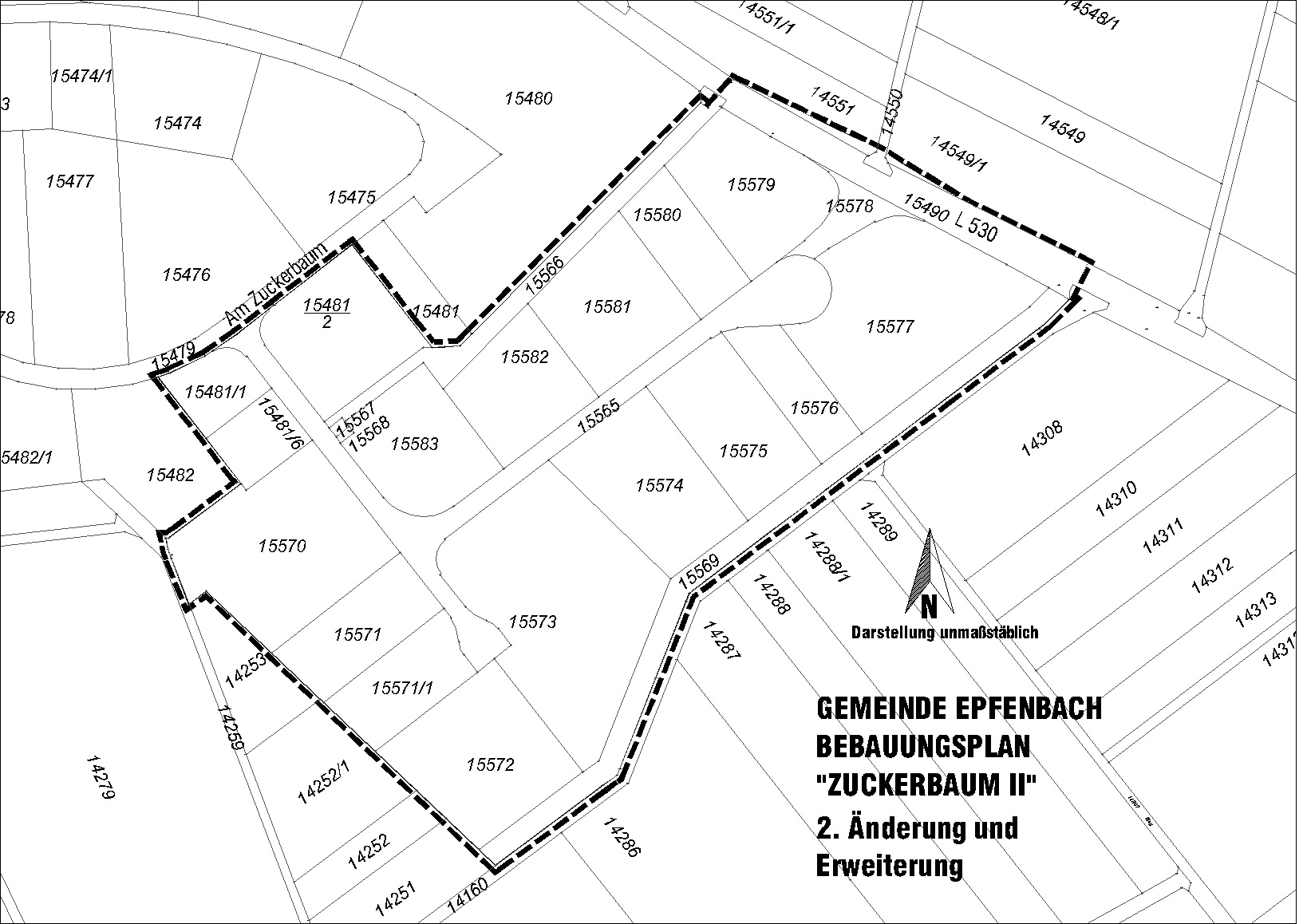 Das Plangebiet wird gegenüber der Ursprungsfassung des Bebauungsplanes erweitert um das Flurstück Nr. 15490 (L 530) sowie Teile der Flurstücke Nr. 14549/1, Nr. 14550 sowie Nr. 14551.